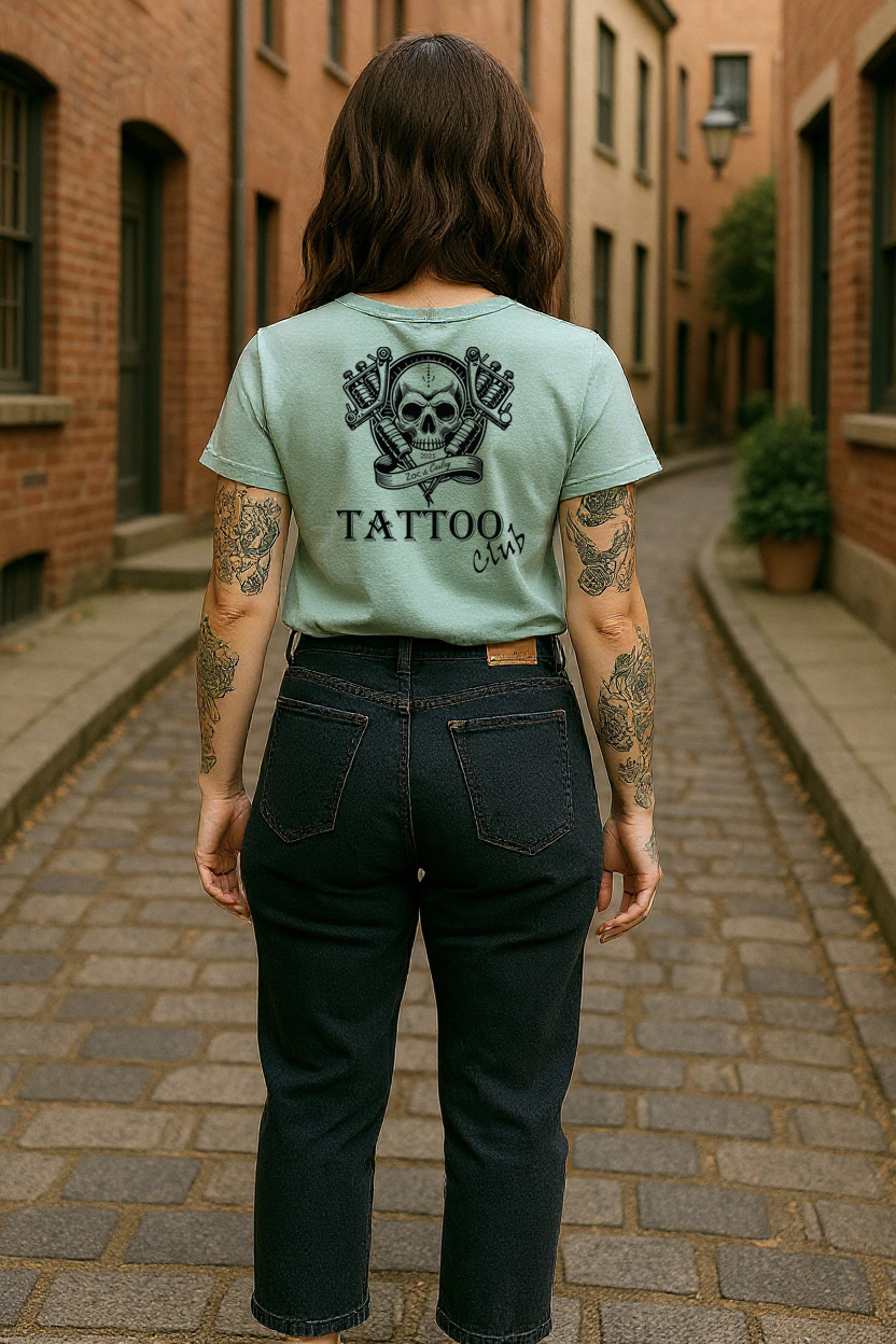 Womens Tee – Tattoo Club – Skull- Aloe